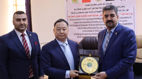 On December 4, Jiang Ming, Deputy General Manager of ZhenHuaOil Co., Ltd. and General Manager of Al-WahaPetroleum Co., Ltd., led a delegation to Wasit University for a donation event. Attendees included Mahdi, Manager of the Midland Oil Company's Wasit Province Branch; Azhar, Chairman of the Joint Management Committee for Ahdeb Oilfield; Mazan, President of Wasit University; Saif, Dean of the College of Information and Technology; and representatives of faculty and students.