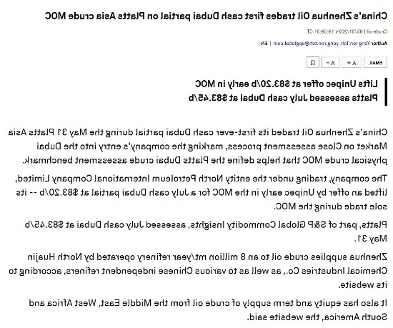 On May 31, ZhenHua Oil successfully completed its first Platts Window trade, and entered the top-tier global crude oil trading platform. This marks a significant step towards upgrading and transforming the company's crude oil trading business and participating in the pricing of Middle East crude oil. Simultaneously, this transaction has successfully opened a new sales channel for the company's UAE long-term contract resources and laid the groundwork for the upcoming spot procurement for the Huajin mega-project.